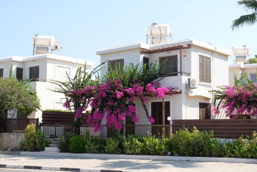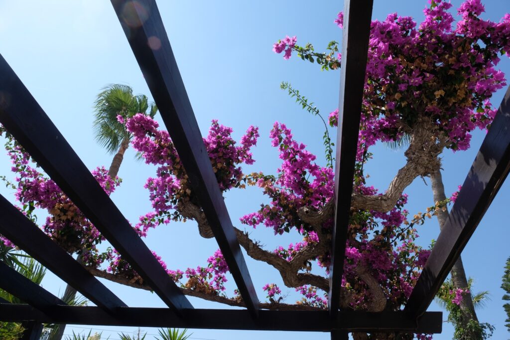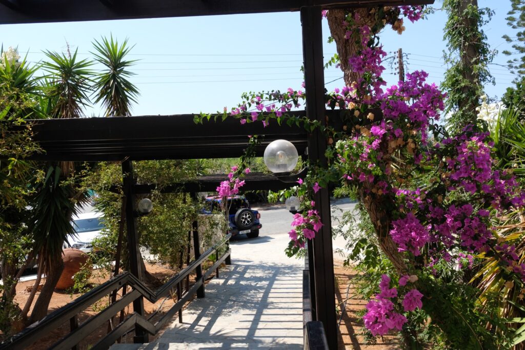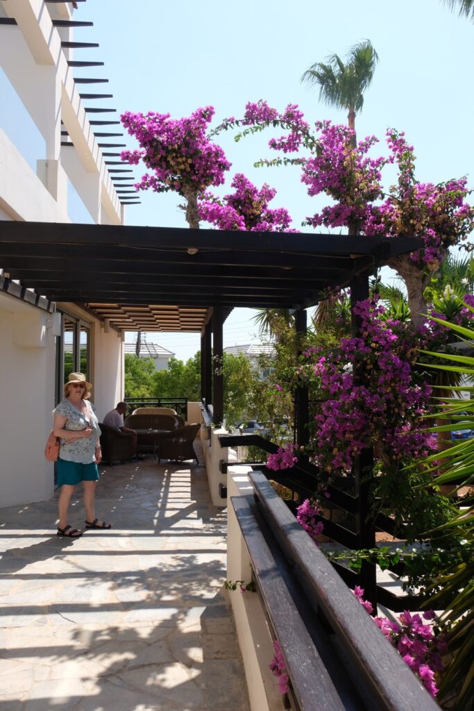 The hotel entrance is so colourful. The white flowers of the Mimossa trail the side hand rails and the Beugonvillia trails above the entrance porch. It all looks beautiful.